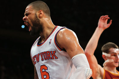 NEW YORK, NY – DECEMBER 15: Tyson Chandler #6 of the New York Knicks celebrates after his dunk and drew the foul against the Cleveland Cavaliers on December 15, 2012 at Madison Square Garden in New York City. The New York Knicks defeated the Cleveland Cavaliers 103-102. NOTE TO USER: User expressly acknowledges and agrees that, by downloading and/or using this photograph, user is consenting to the terms and conditions of the Getty Images License Agreement. (Photo by Elsa/Getty Images)